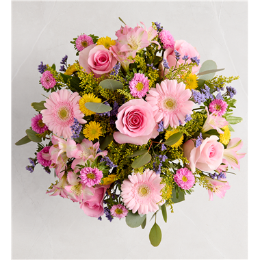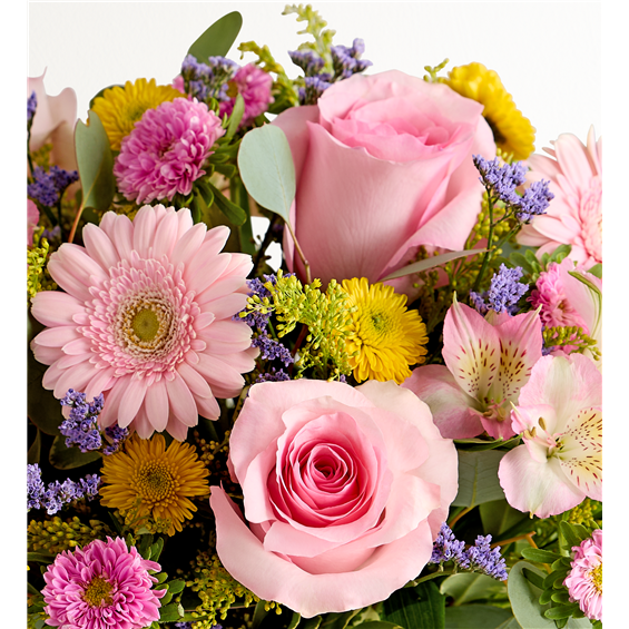All-around arrangement with pink roses, mini Gerbera daisies, Matsumoto asters and Peruvian lilies (alstroemeria), yellow button poms, purple Limonium; accented with assorted greenery