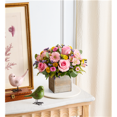 Spring is a time to refresh and reach out. Our spring bouquet celebrates that sentiment. Soft pink and yellow blooms are loosely gathered with lush greenery for style and texture. Designed in our rustic, grey-washed wooden cube, it’s a gift that delivers on your feelings in the most beautiful way.